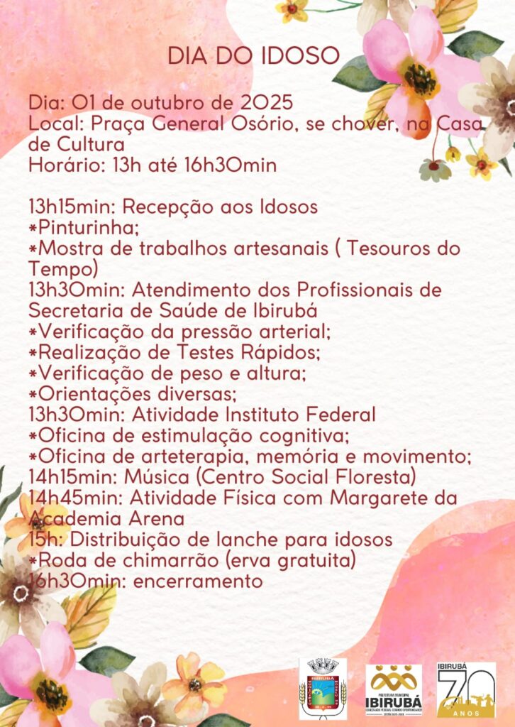 O evento acontece na Praça General Osório, a partir das 13h, com diversas atividades gratuitas voltadas à valorização, ao bem-estar e à integração da pessoa idosa. Em caso de chuva, a programação será transferida para a Casa de Cultura.